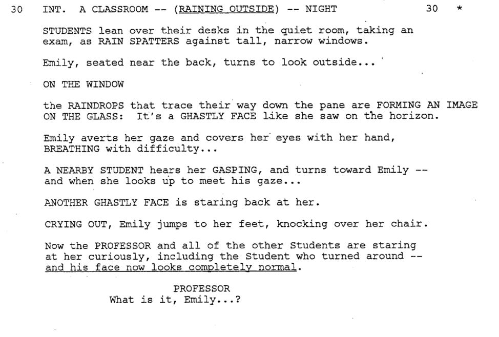 В ужасах часто берут условно бытовое действие и добавляют в него нечто «потустороннее»: наливает воду из-под крана – пугают тем, что льётся кровь; смотрят в зеркало и отворачиваются – пугают тем, что отражение в зеркале само по себе; или вот как в Эмили, идёт обычное занятие у студентов – пугают тем, что рандомно возникают демонические лица.