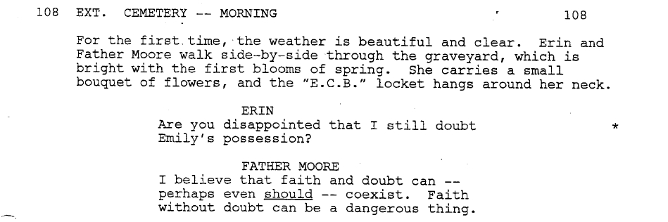 Сомнение и вера должны сосуществовать. Вера без сомнений может быть опасной. … Не важно, что, по вашему мнению, случилось с Эмили, её смерть заставляет задаться важнейшими вопросами. И люди задают эти вопросы, поэтому её страдание, её смерть не были напрасными.