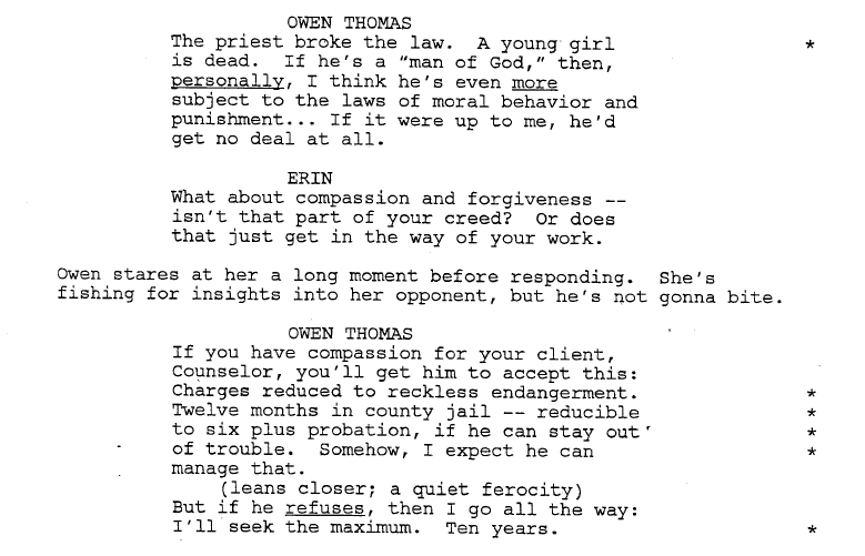 К 19 странице сценария в зале суда нам определяют ставки для главных героев: если Эрин и Мор проиграют, она лишится карьеры, а он сядет на 10 лет. К 21 странице «Шесть демонов Эмили Роуз» подходят к концу первого акта, когда принимают ставки и в кадре произносят: «Мы готовы начинать слушания. Мой клиент хочет, чтобы мир узнал правду».